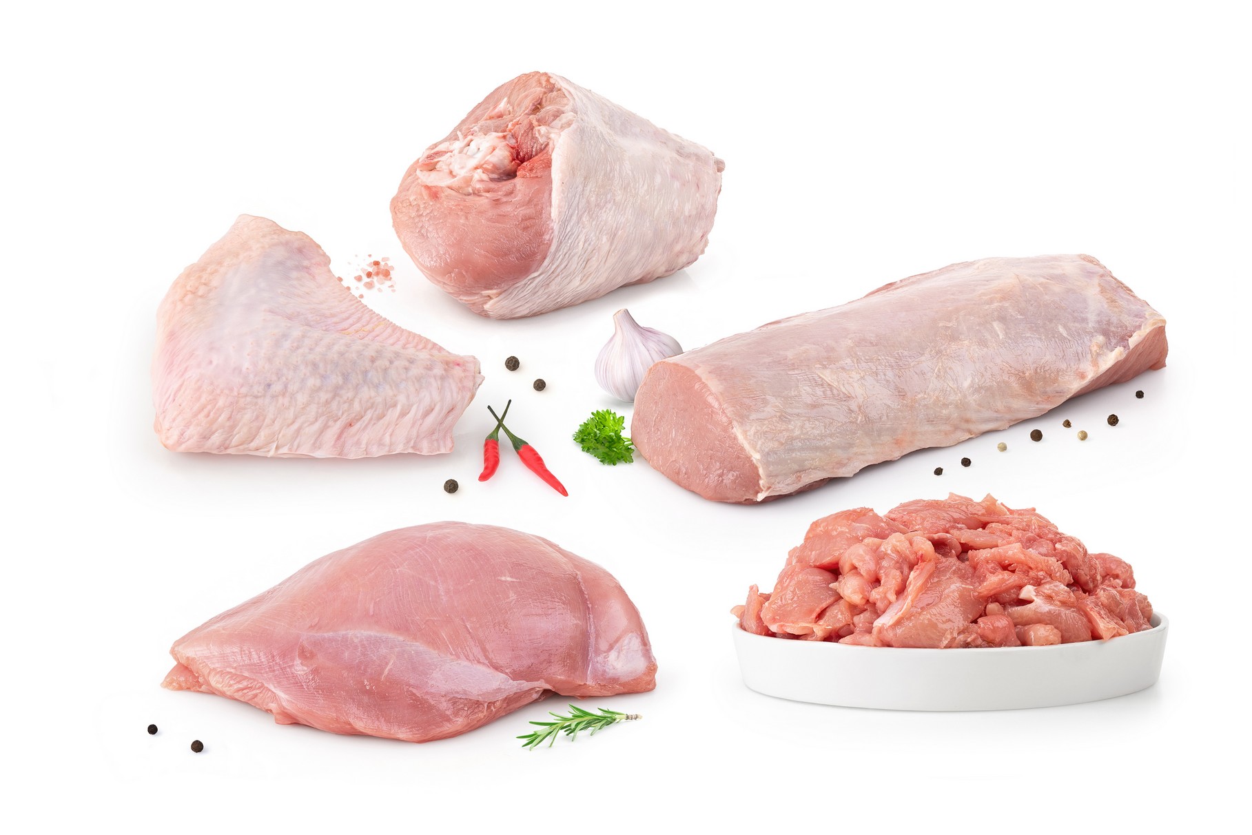 Zestaw Obiadowy – pięć rodzajów świeżego mięsa z indyka i wieprzowiny. Idealny na codzienne obiady: schab, filet, golonka, skrzydło i gulasz. Wysoka jakość i naturalny smak prosto z naszej masarni.